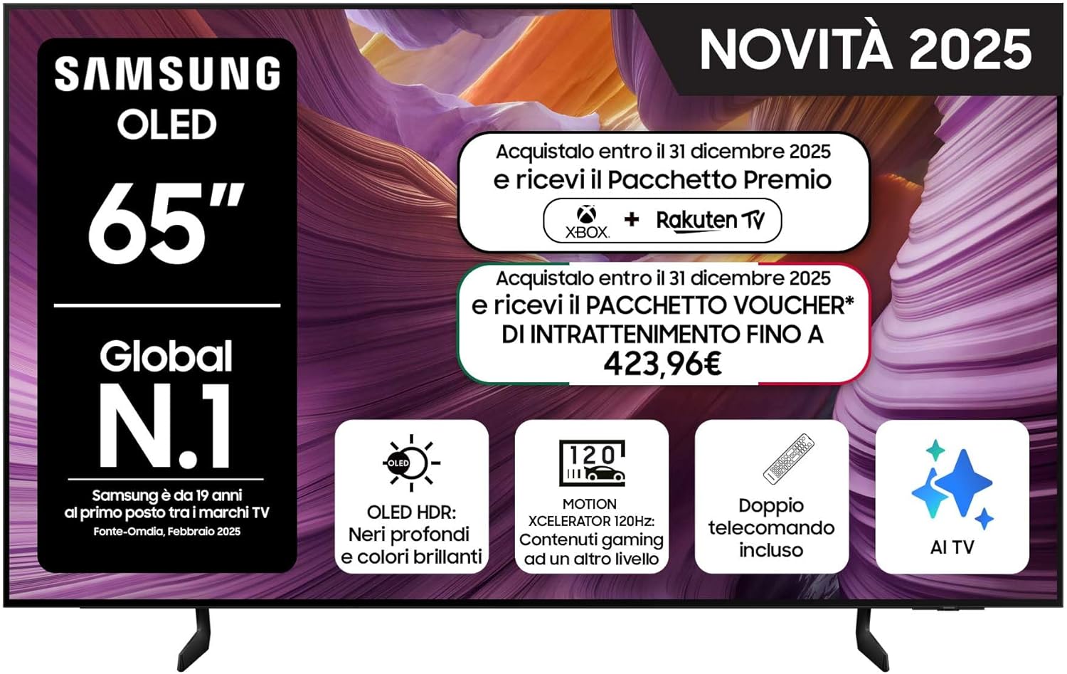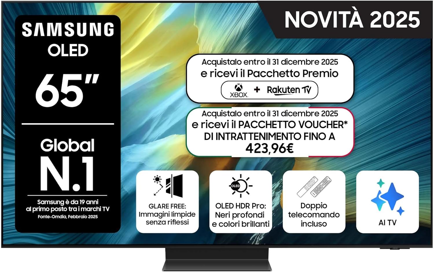 Samsung OLED 4K Vision AI Smart TV 65 pollici QE65S95FAEXZT, NQ4 AI Gen4 Processor, 4K AI Upscaling, Glare Free, Dolby Atmos e OTS, Infinity One Design, PACCHETTO INTRATTENIMENTO, 2025